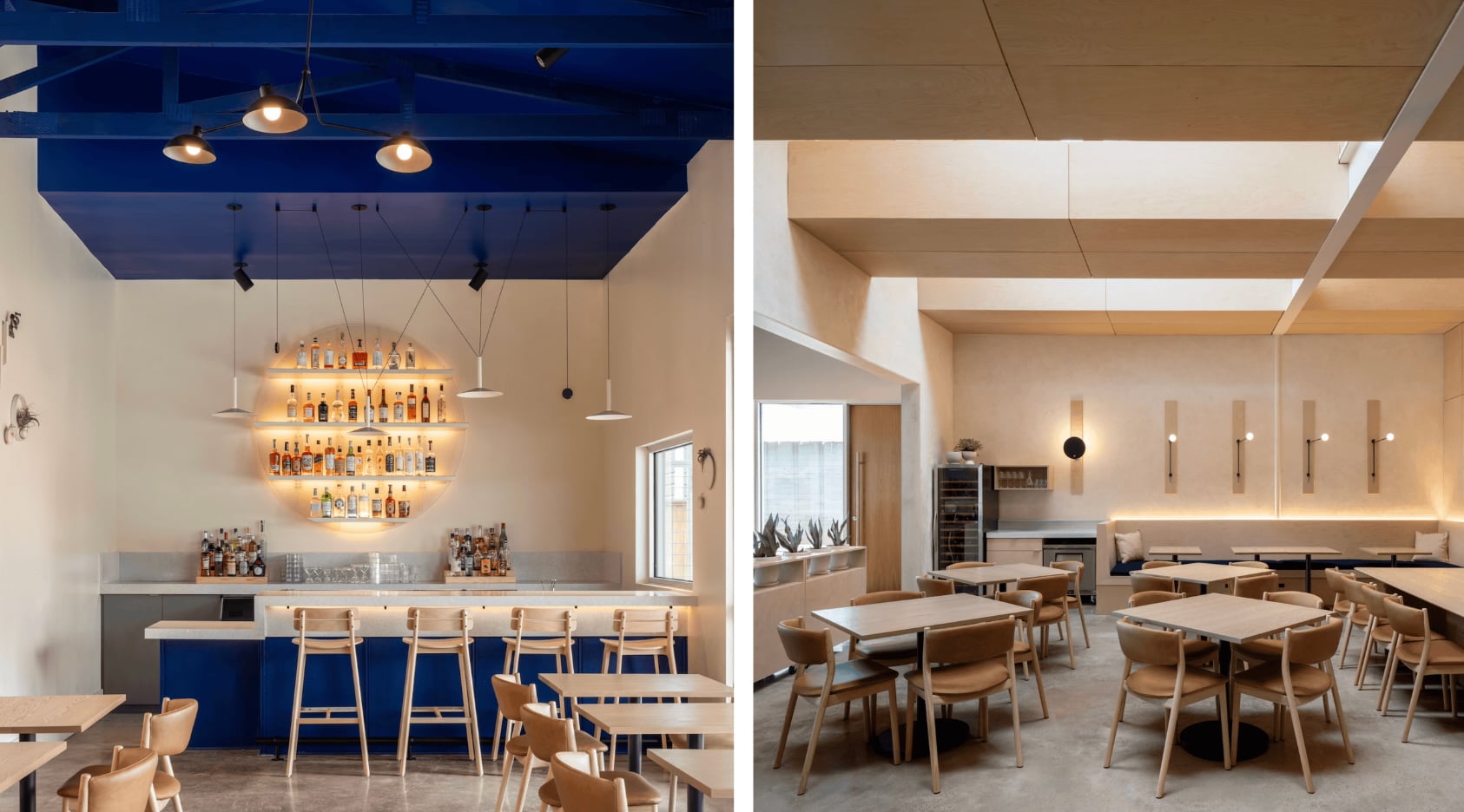 The restaurant's floor plan is divided into four sections: an open veranda, the bar, the indoor dining room, and the open kitchen. You'll see custom built-in millwork in the banquette seating, shelves, and credenzas, as well as a painted perforated-metal bar. Skylights in the gables bathe the entire space with light.