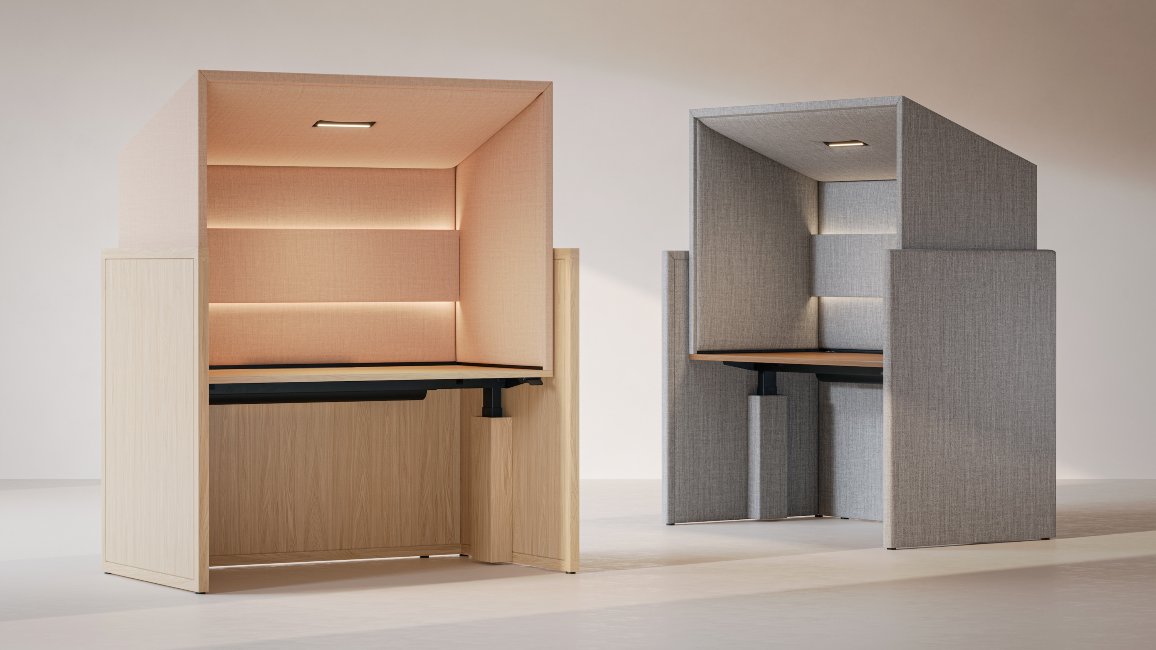 Other key features include a height-adjustable work surface with intuitive controls, integrated dimmable lighting for tasks and to look great on video calls, optional lighting occupancy sensors, and built-in power for devices. The fully upholstered privacy hood can be specified in multiple fabrics, and the lower surround is available in wood veneer, laminate, or upholstery.