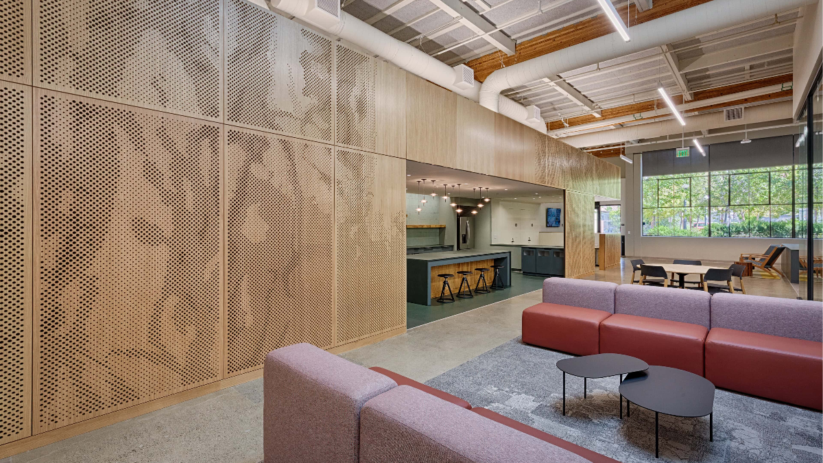 The patterns are custom and incredibly site-specific: The lobby references a kelp-forest array at Stanford’s Hopkins Marine Station, while the back-of-house wall depicts the iconic Stanford Dish and surrounding hills. Decorative and didactic? We love an overachiever.