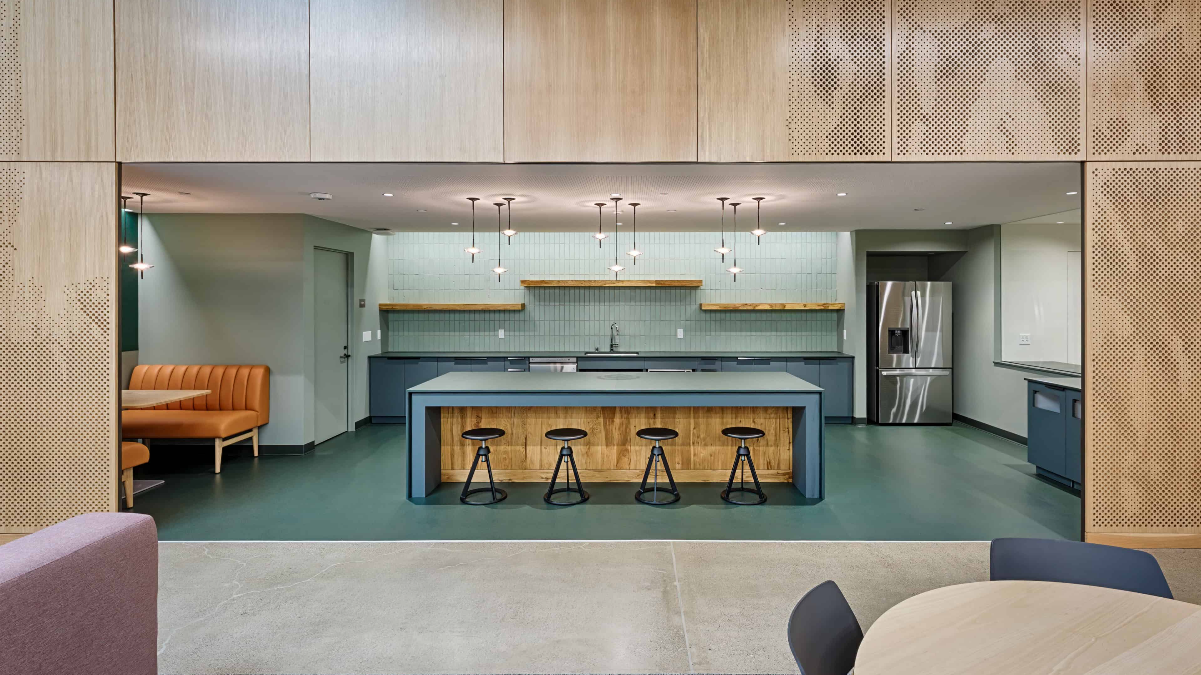 The lounge and kitchen aren’t afterthoughts; instead, they’re central to how the space works. These areas scale down the formality of being on campus and create a welcoming, human-scale environment for meaningful conversations.