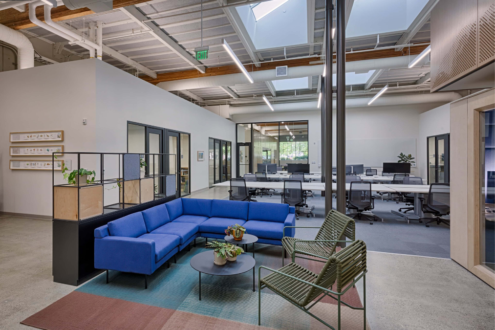 The original structure was once part of a massive publishing complex that filled an entire campus block at Stanford University. Over decades, most of the building was demolished—leaving behind a concrete warehouse shell with “a single window,” as CAW principal Kaori Abiko puts it. The biggest challenge? Daylight—or, rather, the lack of it. Instead of fighting the building’s industrial DNA, the team leaned in, treating the warehouse as a shell ready for reinvention.