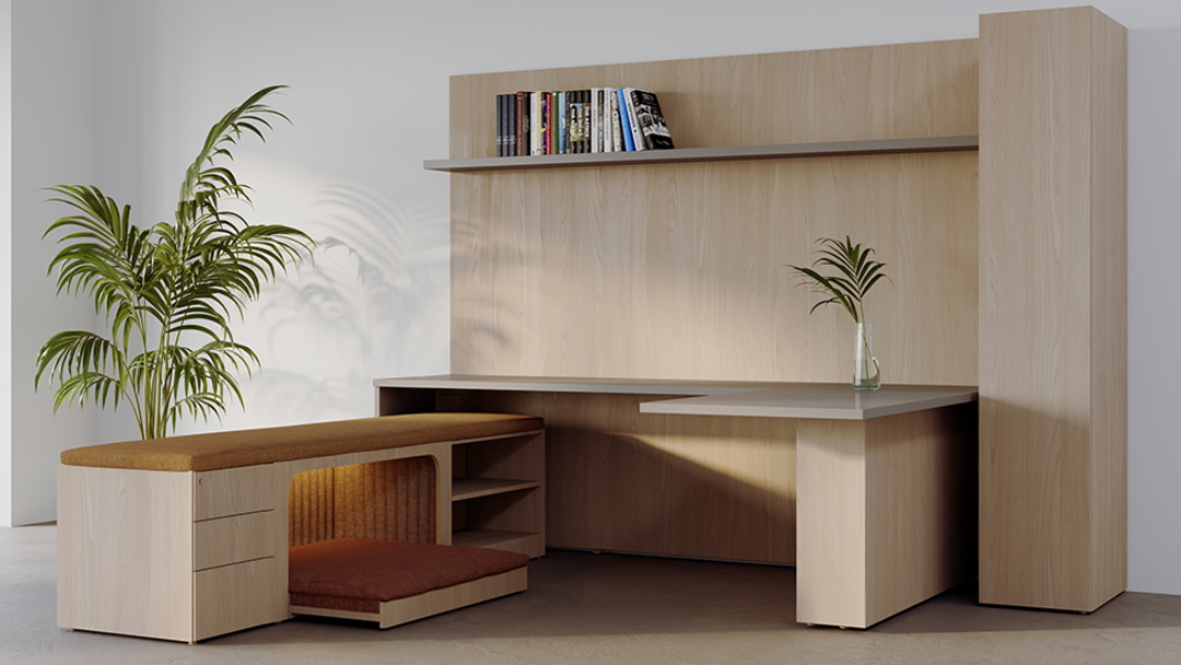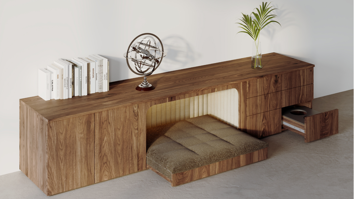 It looks like a sleek piece of office furniture (seamlessly matching DARRAN’s Central Park line), but it includes a "shelter" cutout equipped with a soft bed, warm lighting, and sound-dampening upholstery to keep things peaceful for your pet. The bed can pull out and expand for larger animals, and the unit includes storage drawers with integrated food and water bowls. The fabrics are PFAS-free and machine washable, because life happens. It even earns sustainability points because it’s manufactured in High Point, North Carolina, using water-based finishes and locally sourced materials.