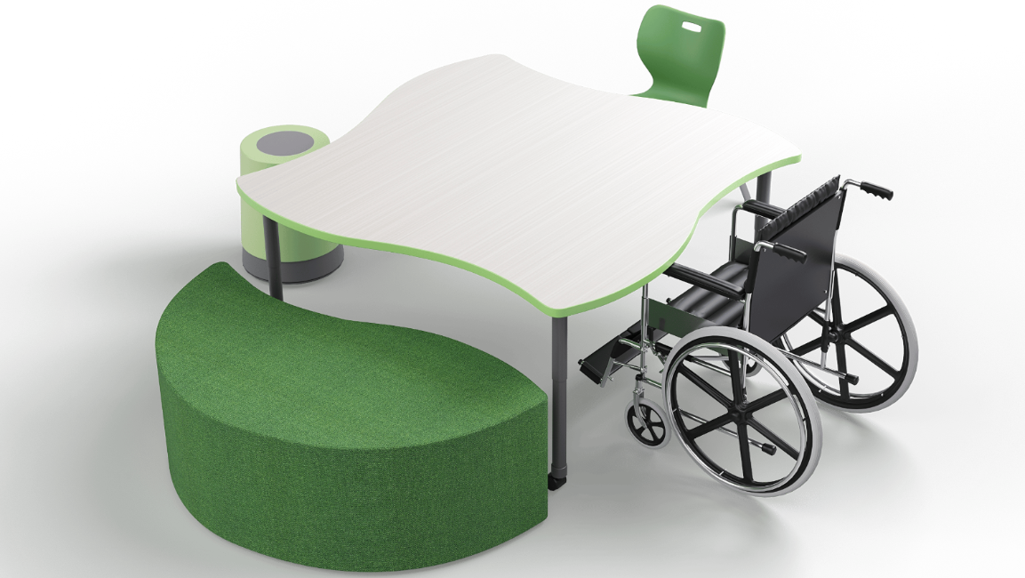 Not all students interact with spaces in the same way. Martinez collaborates with specialists to adapt setups for students using eye-gaze communication systems or wheelchairs. “In one case, I found a slim, adjustable-height table on wheels that we could move around the classroom,” she says. It allowed a student to communicate regardless of posture changes.