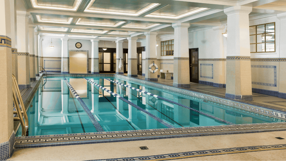 That pool became Tim Barber Architects’s first restoration project when the firm began working with the club in 2013. And it quickly revealed just how much history was hiding in plain sight. “We discovered that the 1960s parking addition had covered the original windows to the pool,” Tim explains. “We converted these long-closed windows into back-lit fenestration … and added mirrors to enhance the light.” The team also tracked down the original tile manufacturer to faithfully recreate the mosaic flooring, wainscot, and pool coping—a level of material commitment that borders on architectural detective work.