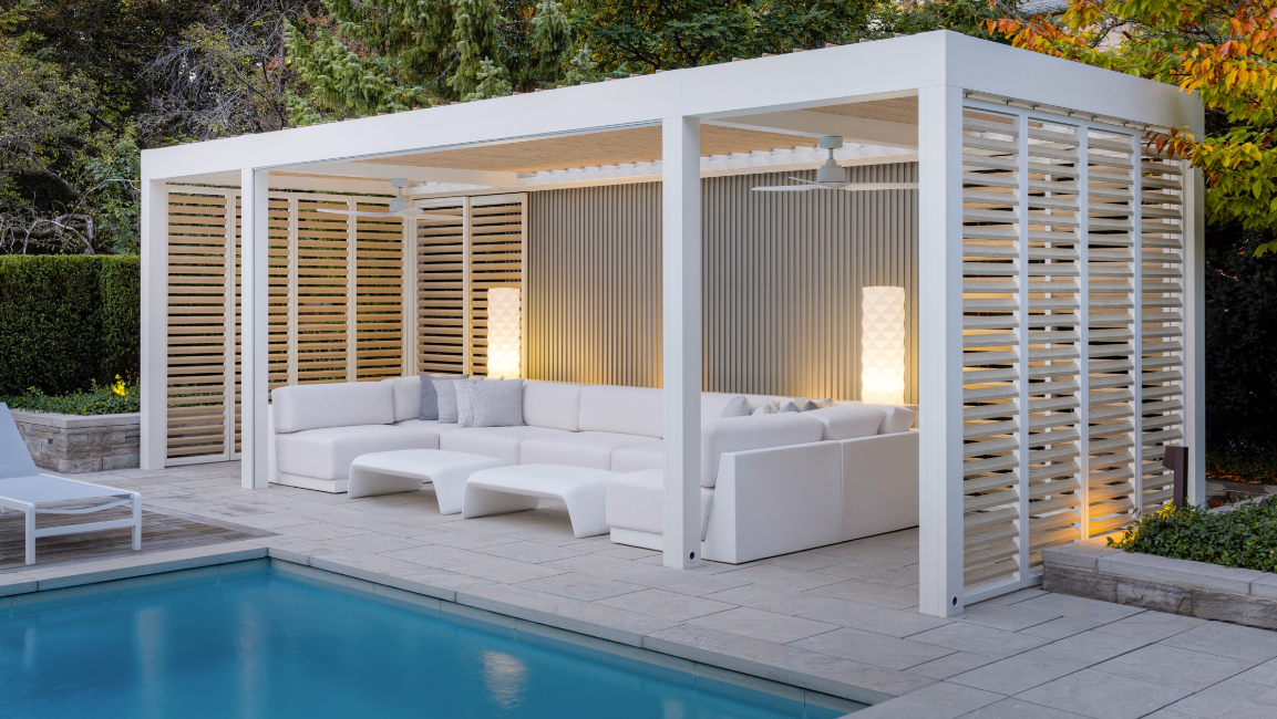 Own the outdoors year-round with Renson's Camargue pergola system, which provides shelter from the elements with weather sensors, durable aluminum construction, and smart control options for tablet or smartphone app integration. A motorized aluminum louver roof controls light, shade, and ventilation by rotating from a gentle incline for filtered sun to a fully closed, rain-resistant shelter. Integrated LED lighting, heating, and audio options extend usability from day into night.