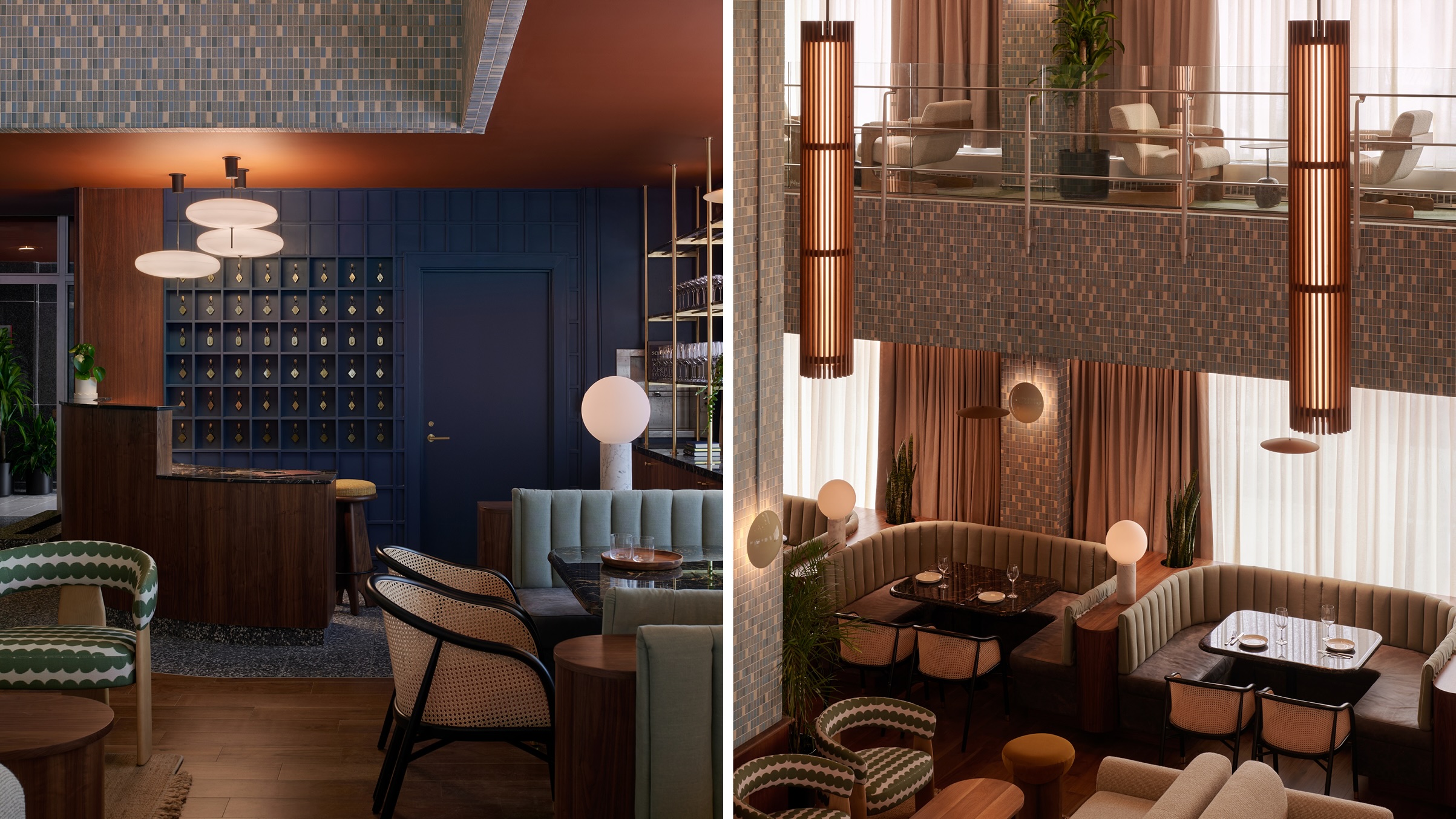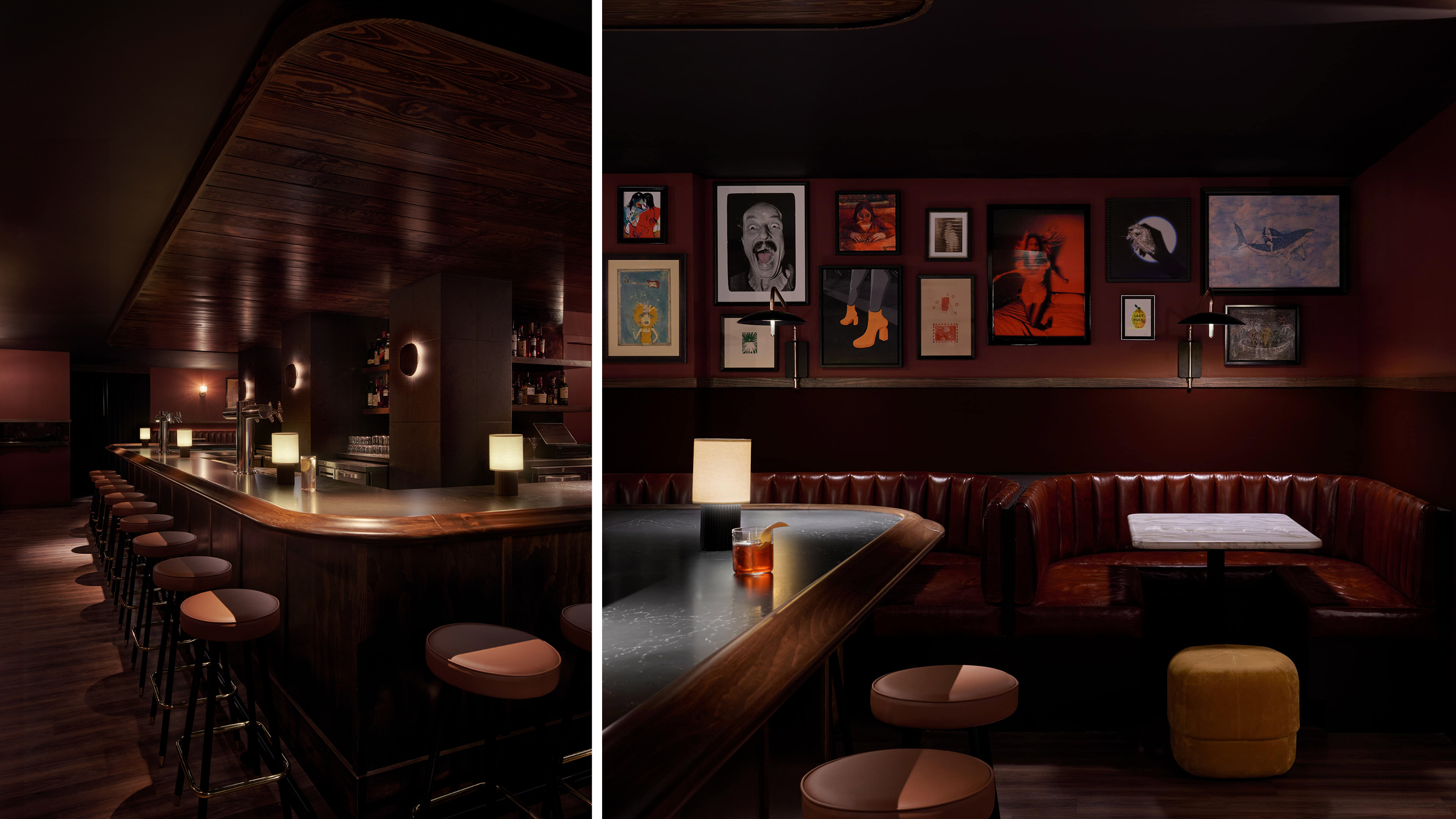 The cocktail culture of Midnight Auteur adds yet another layer to the public space scene. “We hold a deep, and slightly obsessive, reverence for the all-day lobby bar, which is really the foundation of Midnight Auteur,” says Ryan Diggins, CEO of the hospitality brand he cofounded with partners David Kaplan and Alex Day, the three responsible for renowned cocktail bar and brand Death & Co. But AAmp made sure the architecture remained center stage, balancing semicircular walnut bars and atmospheric lighting with original troffer lights and rectilinear bones. The result is immersive but never theme-y.