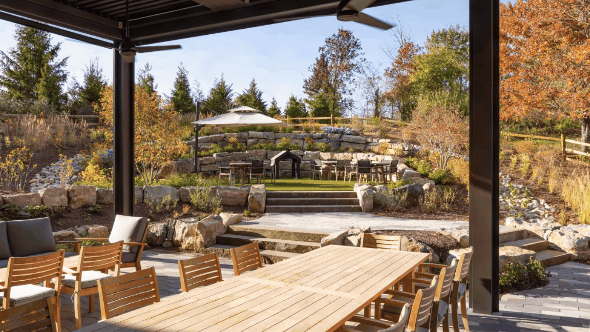 “The building was nestled into the topography of the site, which provided opportunities to carve into the earth with beautiful, curved stone retaining walls, landscape buffers with an abundance of mature trees, large scale sculptures of dogs, and other design elements, allowing the actual pet fencing to recede into the background,” Kate and Nancy explain.