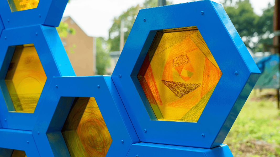 “They wanted the alley to highlight the community’s strength and resilience instead,” Maeghann explains. Each honeycomb serves as a zone of reflection around the area's past, present, and future. Artwork created by neighborhood youth is placed onto a yellow polycarbonate panel, which gives it a stained-glass-like effect. The art is especially impactful at night when the units are illuminated and create a cascade of color along the pathway. The honeycombs also display words of aspiration and contain built-in planters to provide a place for loved ones and neighbors to honor those who were lost in the area to gun violence. Proper drainage and paving further cleaned up the alley to help accommodate a community garden, local compost, a farmers market, and more.