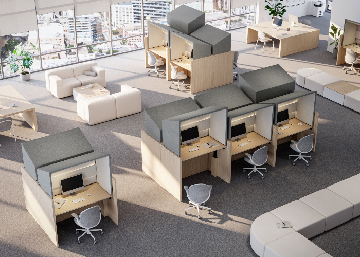 KFI Studios and Gensler rethink open-office productivity with a design-forward solution: Canopy freestanding workstation is a compact, quiet work zone with a height-adjustable work surface, integrated lighting. a fully upholstered hood engineered to reduce ambient noise, limit visual distractions, and create a focused workspace without isolating users from their team. Canopy addresses challenges around acoustics and privacy, and it supports diverse workplace needs, including neurodivergent and hearing-impaired users.