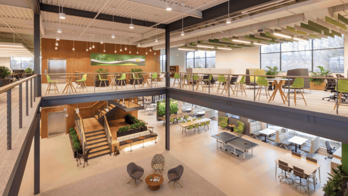 The return to office debate just got a lot cuter. Freshpet’s new Bedminster, New Jersey, headquarters is officially trading gray cubicles for green walls and doggie playrooms. Designed by Studio 1200, the workplace actually feels like a community. The 32,000-square-foot space features a two-story town hall and a one-coffee-station rule to encourage natural run-ins with coworkers. With a focus on "pets, people, and the planet," this modern campus blends high-end architecture with plenty of outdoor space for employees and their furry assistants to sit, and get some work done.