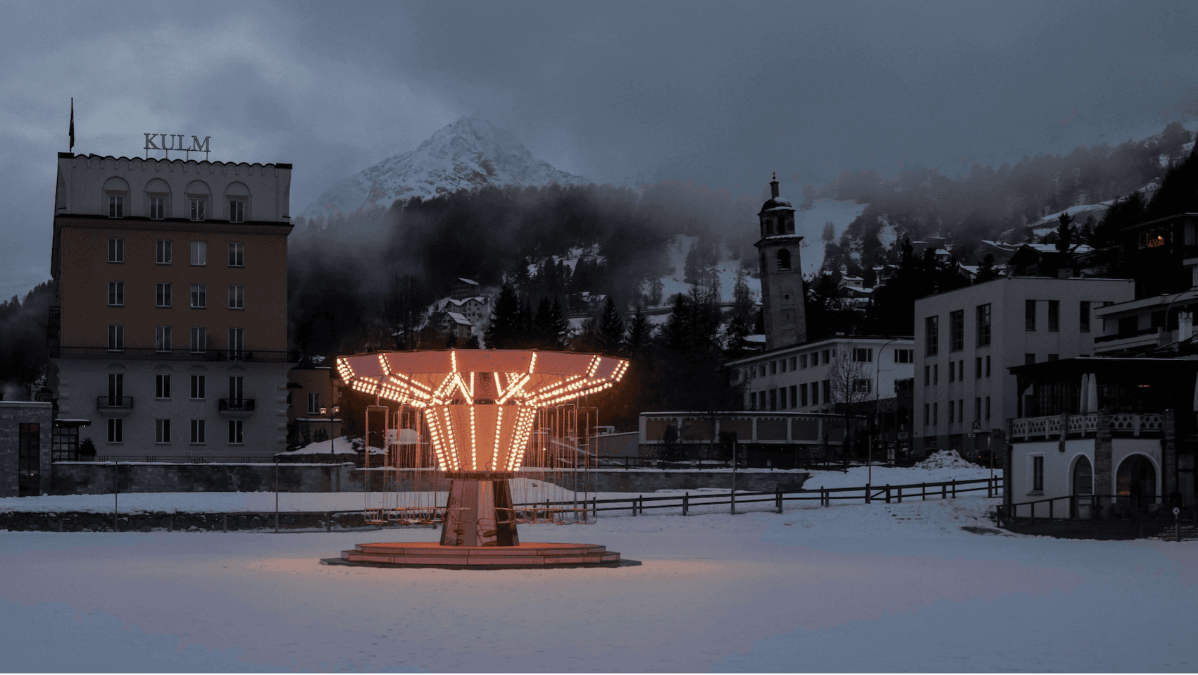 Carsten says his work engages through an "influential environment," and it's not hard to see the influence this vibrant, large-scale outdoor piece has on the snowy resort town. The soft-pink mirrored carousel is installed on Kulm Hotel's ice rink, which means skaters glide right by the altered amusement park ride. Music completes the winter wonderland scene, with a curated selection by Kulm Hotel’s Directeur d’Ambiance Arman Naféei playing.