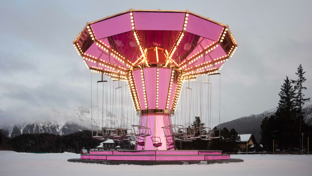 Carsten Höller's latest installation invites viewers to sit down and take a spin—literally. Part experiential art, part plain fun, Pink Mirror Carousel joins the artist's fantastical body of work. With Mirror Carousel (2005), Amusement Park (2006), and Double Carousel with Zöllner Stripes (2011), Carsten explores spectacle, delight, deception, and time through reinterpretations of amusement park rides. The latest interpretation stands against an alpine backdrop at the Kulm Hotel St. Moritz in the Engadin valley of Switzerland.