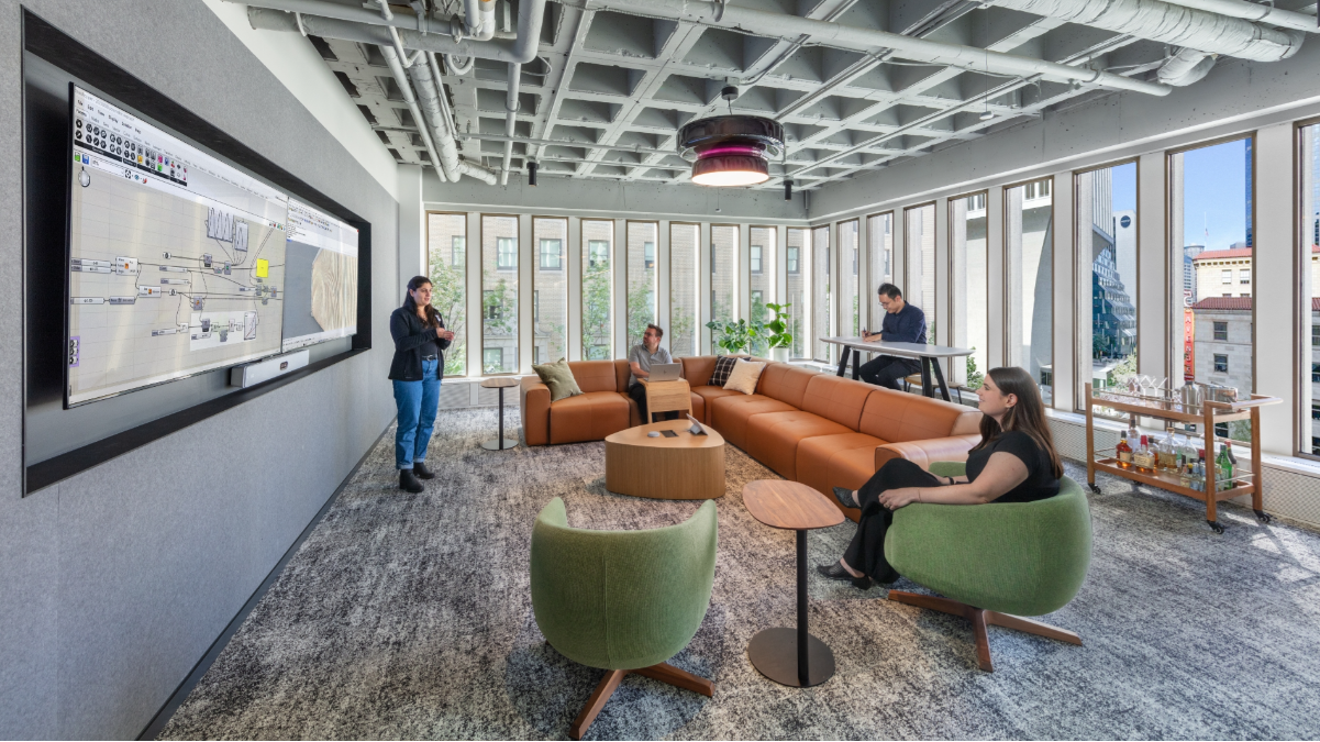 That dialogue between past and present begins the moment you step off the elevator. Floor patterns inspired by regional topography guide visitors inward, leading to a digitally fabricated wood and Corian welcome desk—an abstract nod to Puget Sound’s shipbuilding history. The desk anchors a hospitality-driven zone that includes a lounge, kitchen, and conference room, all designed to flex and flow together.