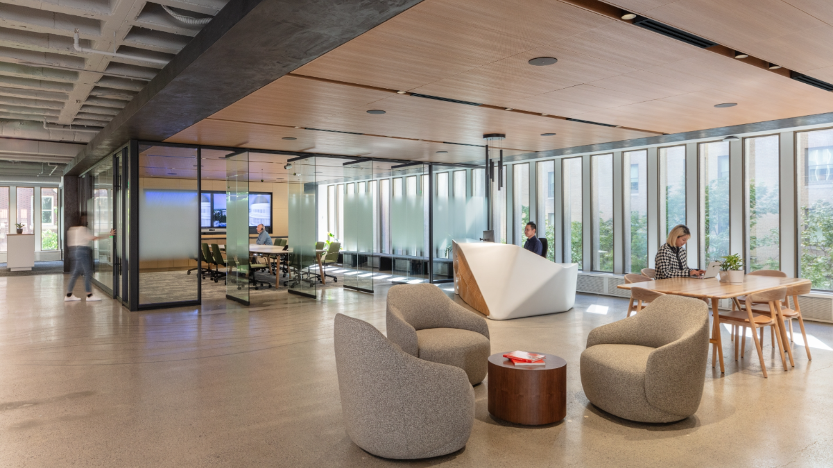Layered throughout are biophilic elements, sound-absorbing materials, and varied ceiling heights that support focus, collaboration, and well-being. Targeting LEED Gold certification, the studio’s exposed structure and concrete floors also help reduce the project’s carbon footprint.