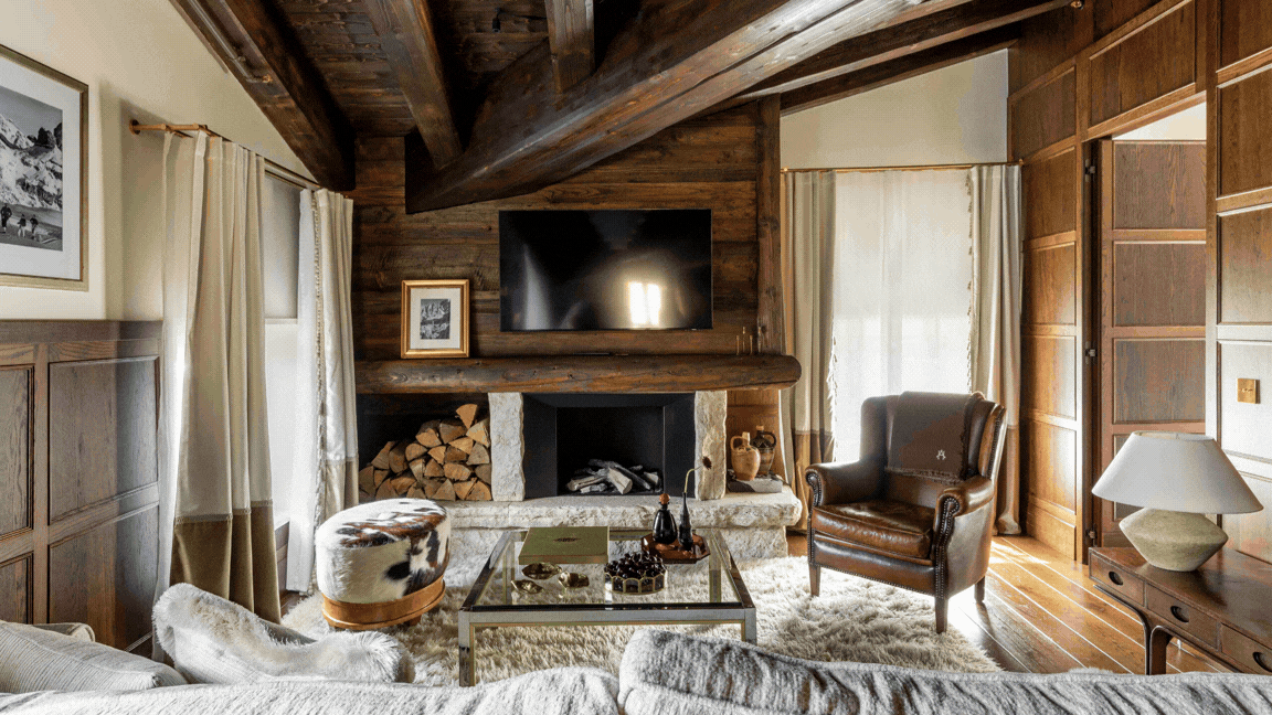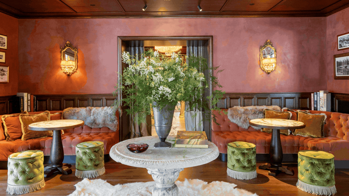 To bring his concept to life, Renzo teamed up with Vicky Charles, founder of New York–based design studio Charles & Co., who approached the project like a true restoration. “The hotel had so much to work with—woodwork, painted ceilings, alpine decorative motifs,” Vicky explains. “Each room had to be a refuge. Bold, without being noisy.”