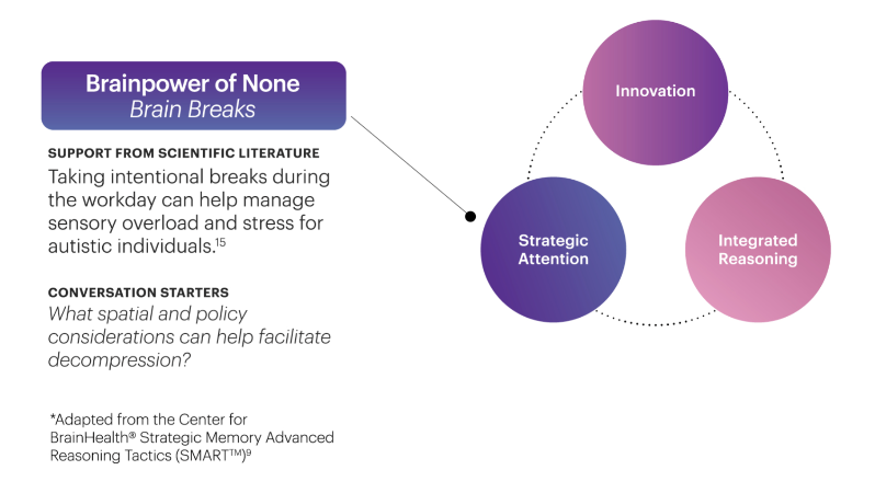 The Brain Healthy Workplaces Report includes nine brain health strategies, five workplace affordances (how we perceive environments to meet our needs), and three habits. While most of the framework holds true for neurotypical and neurodiverse populations, key differences exist.