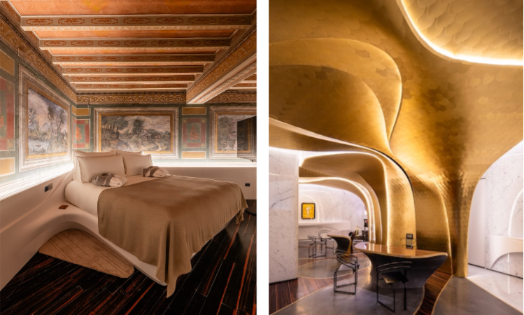 Lavish in detail yet mindful of the environment, the hotel's design incorporates sourced wood, waste reduction, energy-efficient machines, and more. Nothing was sacrificed and no expense was spared in the design of this elegant and indulgent hospitality space: Italian marble and Renaissance details lend a modern, even futuristic, style that spans eras and melds with historic detail. Works by contemporary artists—including Christian Leperino, Mario Schifano, Mimmo Paladino, and Francesco Clemente—stand alongside original artifacts found during excavations, such as a marble head of Livia Drusilla and original frescos featured in five of the guest suites.